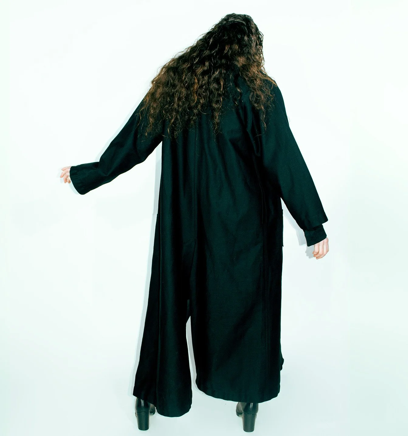 Perfect for the transitional seasons, the Trinity Coat is a long trench coat with side vents, patch pockets and a generous slit up the centre back. Constructed out of black denim with metal poppers as the front closure,